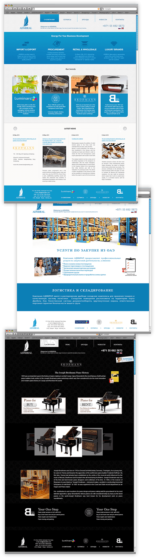 Website of the company Admiral describes all its activities: tourism, sale and rent of pianos and billiard tables, sale of crockery. Stylish design, easy to navigate, quick access to information – all makes this website attractive and useful for visitors.